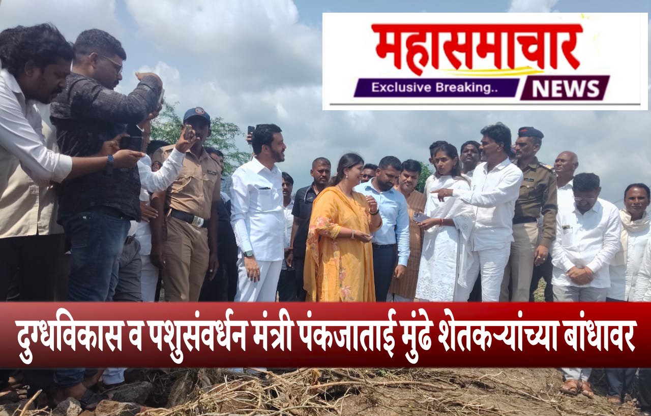 बीड,दि. २४ (जिमाका): बीड जिल्ह्यामध्ये ढगफुटी सदृश पाऊस झाल्याने सिंदफणा नदीला पूर आल्याने या नदीचे पाणी बऱ्याच शेतामध्ये घुसल्याने शेतपिकांचे बरेच नुकसान झाले. या पार्श्वभूमीवर राज्याच्या पर्यावरण व पशुसंवर्धन मंत्री पंकजा मुंडे यांनी आज गेवाराई तालूक्यातील धोंडराई आणि हिरापूर येथील पूराने नुकसान झालेल्या शेतपिकाची पाहणी केली. यावेळी श्रीमती मुंडे यांनी शेतकऱ्यांशी संवाद साधून, बाधीत शेतकऱ्यांना तात्काळ मदत करणार असल्याचे आश्वासित करुन नुकसानग्रस्त भागाचे पंचनामे करण्याचे काम सुरु आहे, परंतु शासनामार्फत पूरग्रस्त भागातील बाधीत नागरिक आणि शेतकऱ्यांना तात्काळ मदत पोहोचविण्याचे काम सुरू आहे. शासन नागरिकाच्या पाठीशी उभे असून कोणीही काळजी करू नये. नुकसानग्रस्त शेतकरी आणि नागरिकांना शासन लवकरात लवकर मदत करणार आहे. शेतपिकांच्या झालेल्या नुकसानीचे पंचनामे करून त्यांना मदत देण्यात येणार आहे. जिल्ह्यातील ज्या भागात ६५ मिमीपेक्षा जास्त पाऊस झाल्यास अतिवृष्टी घोषित करण्याचा नियम आहे, परंतु ६५ मिमी पेक्षा कमी पाऊस झाला असेल त्या ठिकाणचेही पंचनामे करण्याच्या सूचना ही श्रीमती मुंडे यांनी यावेळी प्रशासनाला यावेळी दिल्या.