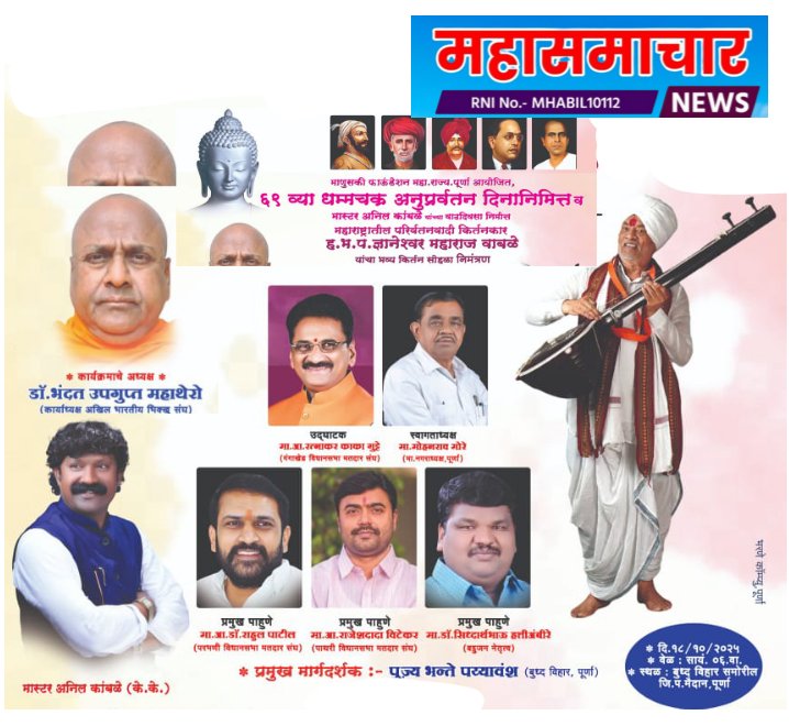 पूर्णा ता.१४ (प्रतिनिधी): माणुसकी फाऊंडेशन महाराष्ट्र राज्य, पूर्णा यांच्या वतीने ६९ वा धम्मचक्र अनुप्रवर्तन दिन व मास्टर अनिल कांबळे यांच्या अभिष्टचिंतन सोहळानिमित्त परिवर्तनवादी किर्तनकार ह.भ.प. ज्ञानेश्वर महाराज वाबळे यांच्या किर्तनाचा भव्य सोहळा आयोजित करण्यात आला आहे. हा कार्यक्रम दि. १८ ऑक्टोबर २०२५ रोजी सायं. ६ वा., बुद्ध विहार समोरील जिल्हा परिषद मैदान, पूर्णा येथे होणार आहे.