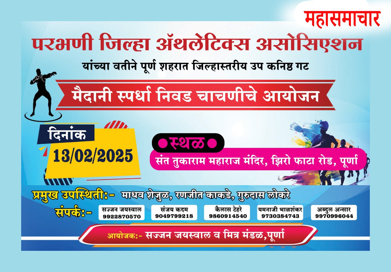 पूर्णेत गुरुवारी सब ज्युनिअर मैदानी स्पर्धा निवड चाचणीचे आयोजन;क्रिडा प्रशिक्षक सज्जन जैस्वाल यांची माहिती