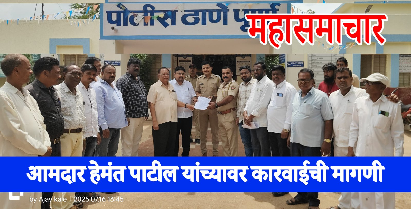 शिवसेना शिंदे गटाचे आमदार हेमंत पाटील यांनी सुरू असलेल्या पावसाळी अधिवेशनामध्ये विधानसभेच्या सभागृहात बोलताना खोटे वक्तव्य व दिशाभूल करुन भावना दुखावल्याची माहिती दिल्याबद्दल त्यांच्यावर कठोर कारवाई करण्यात यावी अशी मागणी पूर्णेतील समाजबांधवांनी पोलिस महासंचालक यांना निवेदनाद्वारे केली आहे.