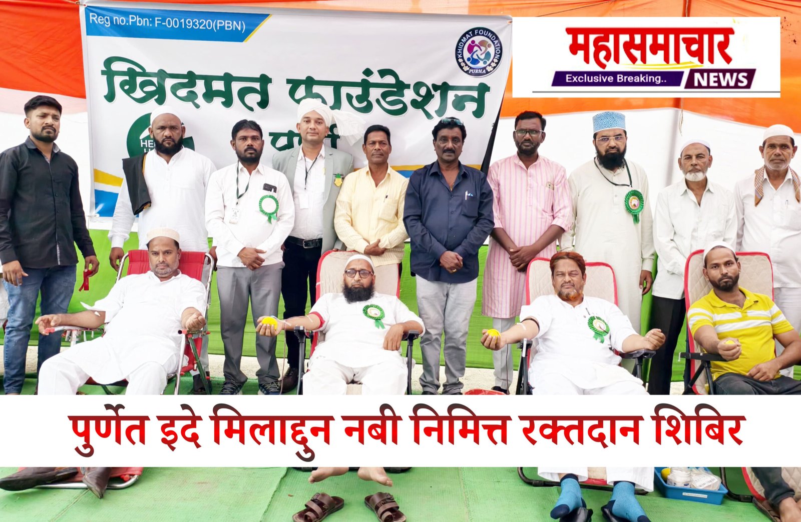 पूर्णा, ता.५ (बातमीदार) : इदे मिलाद्दुन नबी सणानिमित्त जामा मस्जिद समोरील मैदानावर खिदमत फाउंडेशनच्या वतीने शुक्रवारी (ता.५) रक्तदान शिबिरासह विद्यार्थ्यांसाठी विविध स्पर्धांचे आयोजन करण्यात आले. या उपक्रमाला मोठ्या संख्येने नागरिक व विद्यार्थी उपस्थित होते.