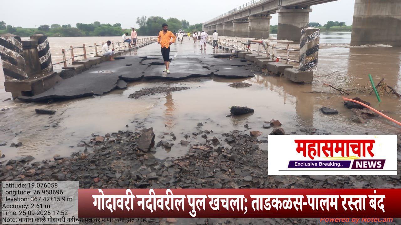 पूर्णा ता.२५ (प्रतिनिधी) Godavari River Bridge Damage on flood गेल्या काही दिवसांपासून सुरु असलेल्या मुसळधार पावसामुळे आणि गोदावरी नदीच्या प्रचंड पुरामुळे पूर्णा तालुक्यातील धानोरा काळे येथील गोदावरी नदीवरील पुलाला मोठा फटका बसला आहे. पुलाचा डांबरी रस्ता कोसळल्याने वाहतूक धोक्यात आली असून सुरक्षेच्या दृष्टीने ताडकळस-पालम राज्यमार्ग अनिश्चित काळासाठी बंद करण्यात आला आहे.ही घटना गुरुवारी (दि.२५ सप्टेंबर) सायंकाळी उघडकीस आली.यानंतर तहसीलदार माधवराव बोथिकर यांनी घटनास्थळी धाव घेऊन पाहणी केली आणि रस्ता तत्काळ वाहतूक बंद करण्याचे आदेश दिले.