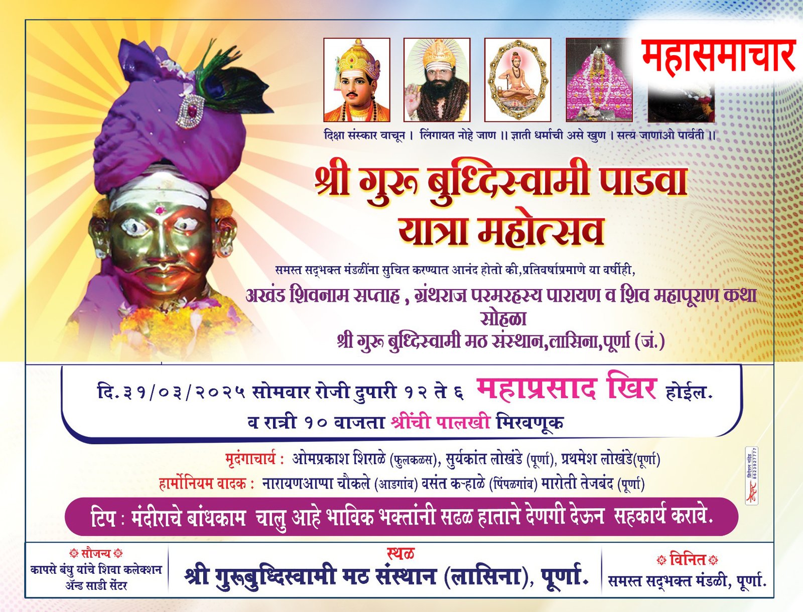 लिंगायत संप्रदायातील संत श्री गुरू बुध्दिस्वामी मठ संस्थान, लासिना, पूर्णा येथे गुढीपाडवा यात्रा महोत्सव ता.२२ ते ३१ मार्च दरम्यान साजरा होणार असून, यानिमित्ताने पूर्णेत विविध कार्यकमांचे आयोजन करण्यात आले असून, जय्यत तयारी सुरू आहे.अखंड शिवनाम सप्ताह, अंतर्गत ग्रंथराज परमरहस्य पारायण मार्गदर्शक श्री नारायणअप्पा चौकले, सितारामअप्पा कापुसकरी व महिला रूद्र मंडळ, पूर्णा. शिवमहापुराण कथा प्रवक्ते श्री नागेश महाराज विभुते वाडी (दमई)यांचे संगित शिवमहापुराण दुपारी १ ते ४ पर्यंत,दैनंदिन कार्यक्रम पहाटे ५ ते ६ शिवपाठ, सकाळी ६ ते ७ रुद्राभिषेक, सकाळी ७ ते ९ परमरहस्य ग्रंथ पारायण,