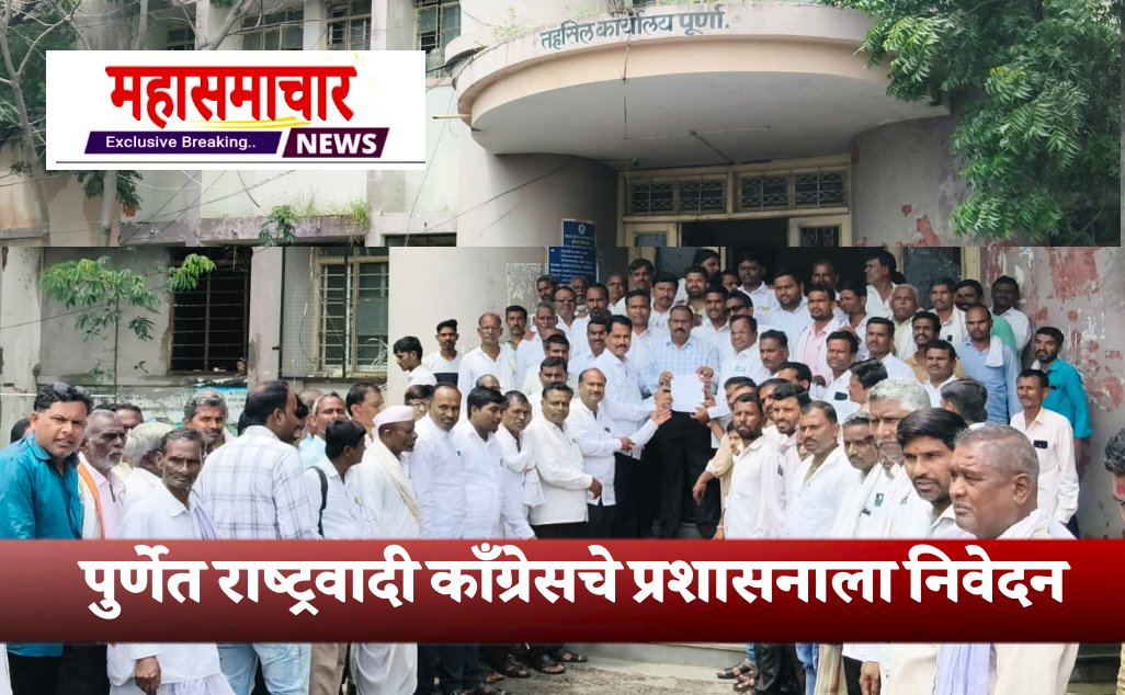 पूर्णा अतिवृष्टीमुळे नुकसान झालेल्या पिकांचे पंचनामे करून मदत जाहीर करा-राष्ट्रवादी काँग्रेसची मागणी