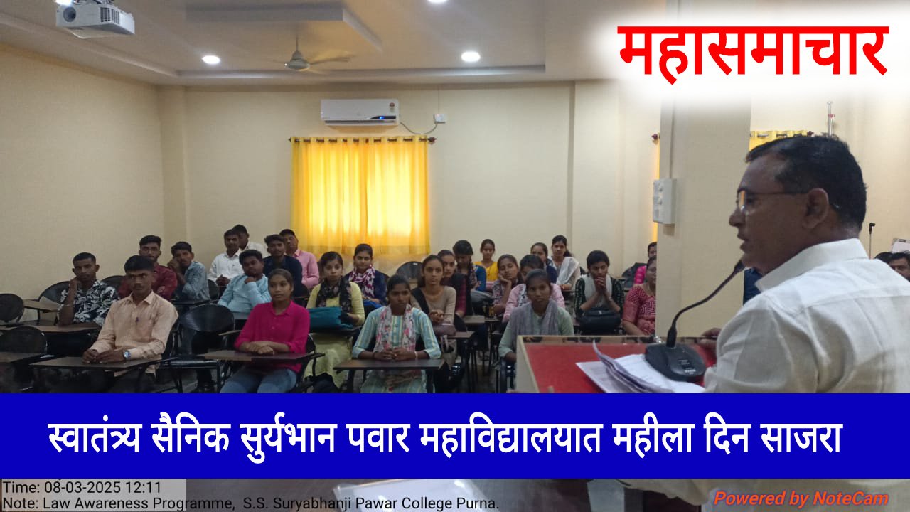 पूर्णा येथील स्वातंत्र्यसैनिक सूर्यभानजी पवार महाविद्यालयात ८ मार्च रोजी महिला दिनानिमित्त ” महिला कायदे विषयक जागृती “शिबीर घेण्यात आले यावेळी व्याख्यानात अँड भालेराव प्रमुख मार्गदर्शक म्हणून बोलत होते.पुढे बोलताना ते म्हणाले की, समाजात वावरताना स्त्री – पुरुष असमानता अनेक प्रसंगी पाहायला मिळते. भारतीय महिलांना संरक्षण देणाऱ्या विशेष कायद्याची भारतीय संविधानात तरतूद असून त्यामुळे भारतीय महिला सन्मानाने आपले जीवन जगता येत आहे.लिंग निदान करणे , स्त्री अर्भकाचा गर्भपात करणे यावर बंदी घातली असून बालविवाह बंदी, बालकामगार कायदा, विधवा पुनर्विवाह कायदा, पोटगी ,सार्वजनिक ठिकाणी समान वेतन कायदा अशा वेगवेगळ्या कायद्याद्वारे स्त्रियांच्या जीवनात सन्मान वाढला आहे असेही ते म्हणाले . स्त्रियांनी देखील जास्तीत जास्त शिक्षण घेऊन कायद्याचा अभ्यास केला पाहिजे व सन्मानाने जगायला शिकले पाहिजे असे त्यांनी आपल्या सविस्तर मार्गदर्शनात सांगितले.या कार्यक्रमाचे अध्यक्ष महाविद्यालयाचे प्राचार्य डॉ. रामेश्वर पवार तर मंचावर डॉ. भीमराव मानकरे उपस्थित होते.