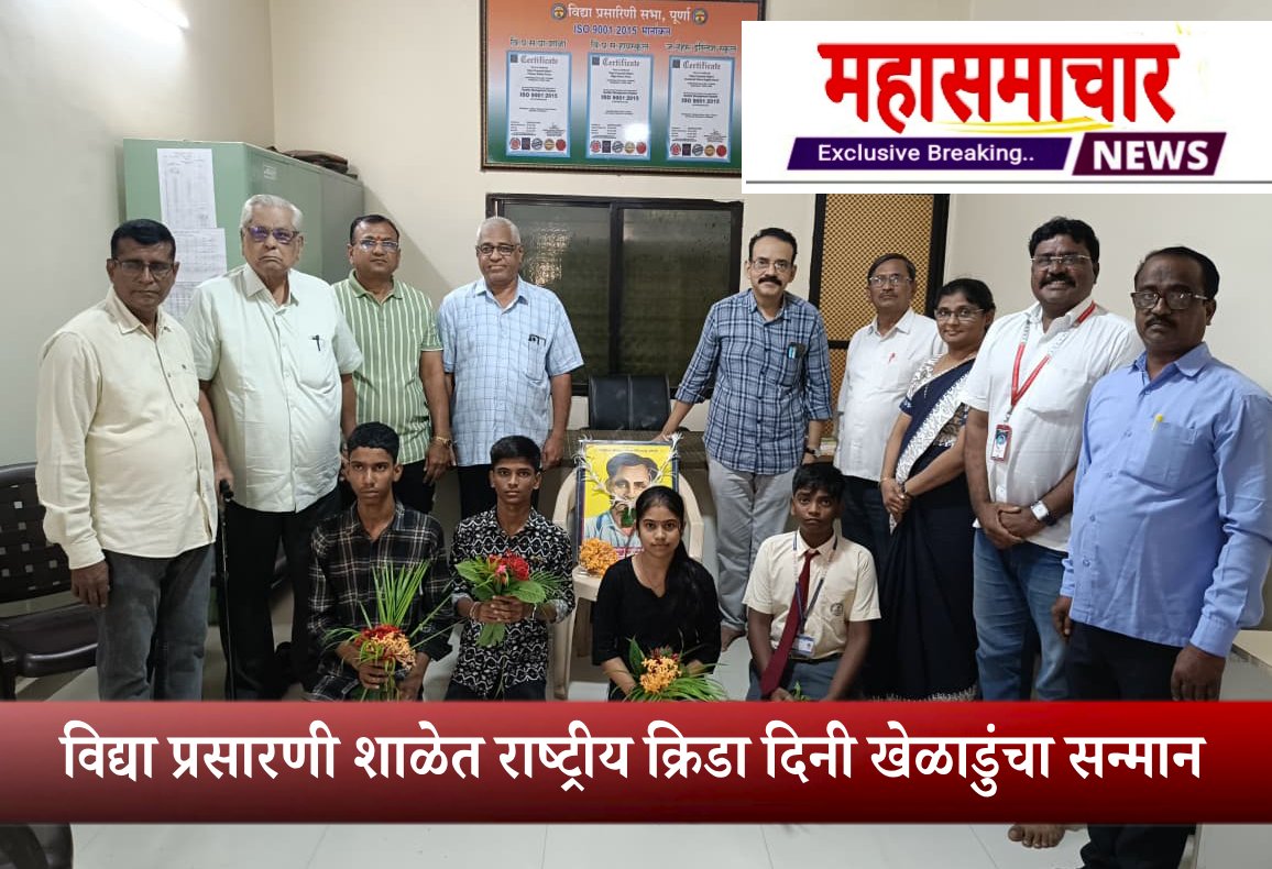 पुर्णा येथिल विद्या प्रसारणी शाळेत संस्थेचे अध्यक्ष डॉ.विनय वाघमारे यांच्या प्रमुख उपस्थितीत आज शुक्रवारी २९ ऑगस्ट रोजी राष्ट्रीय क्रिडा दिनाचे आयोजन करण्यात आले होते‌.प्रसंगी श्रीनिवासजी काबरा, डॉ.हरिभाऊ पाटील, मुख्याध्यापक देविदास उमाटे, शिवदर्शन हिंगणे, मुख्याध्यापिका श्रीमती अतिया बेगम, शेख जब्बार, पाराशर स्वामी, आदींची उपस्थिती होती.प्रसंगी हॉकीचे जादूगार मेजर ध्यानचंद यांच्या प्रतिमेचे पूजन करण्यात आले. नुकतेच पार पडलेल्या शालेय जिल्हास्तरीय कॅरम स्पर्धेमध्ये विजयी झालेल्या अनोमा रत्नदीप एगडे,वेदांत युवराज गव्हाणे, उजेरखान मोहसीन खान पठाण,रिंकी डोंगरे या खेळाडुंसह क्रिडा प्रशिक्षक मार्गदर्शक प्रकाश रौंदळे, सज्जन जैस्वाल सत्कार करण्यात आला.