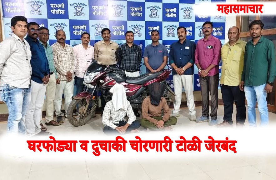 शहरासह जिल्हयात होणार्या घरफोडया व मोटार सायकल चोरीबाबत तपास करण्यासाठी स्थानिक गुन्हा शाखेचे पथक रवाना करण्यात आले होते. या पथकाने शोध घेत असतांना गोपनीय माहिती मिळाल्यावरून आरोपी कालासिंग गुरू बवनसिंग दुधानी (वय 20) राहणार साखला प्लॉट परभणी, राहुलसिंग धारासिंग दुधानी (वय 18) राहणार साखला प्लॉट परभणी यांना ताब्यात घेऊन चौकशी केली असता दैठणा पोलिस स्टेशन अंतर्गत पोखर्णी फाटा येथील दुकानाचे शेटर उचकटून घरफोडी करत रक्कम चोरली तसेच पाथरी पोलीस स्टेशन हद्दीत एक मोटारसायकल चोरल्याचे सांगीतले. या आरोपींकडून गुन्हयात चोरी गेलेली मोटारसायकल व मुद्द रक्कम असा एकूण 61 हजार 900 रूपयांचा मुद्देमाल हस्तगत करून आरोपींना पुढील तपासकामी दैठणा पोलिस ठाणे येथे हजर करण्यात आले आहे.ही कारवाई पोलिस अधिक्षक रविंद्रसिंह परदेशी यांच्या मार्गदर्शनात अप्पर पोलिस अधिक्षक यशवंत काळे यांच्या नेतृत्वात पोलिस निरिक्षक विवेकानंद पाटील, सहाय्यक पोलिस निरिक्षक राजु मुतेफोड, सहाय्यक पोलिस अमलदार चट्टे, सुग्रिव केंद्रे, निलेश भुजबळ, रणजित आगळे, सुर्यकांत फड, लक्ष्मण कांंगणे, निलेश परसोडे, रफियोदीन शेख, परसराम गायकवाड, दिपक मुदीराज आणि सायबर पोलिस ठाण्याचे गणेश कौठकर यांच्या पथकाने मिळून केली.