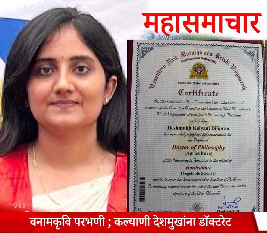 परभणी;कल्याणी देशमुखांना व.ना. मराठवाडा कृषी विद्यापीठा कडून डाॅक्टरेट