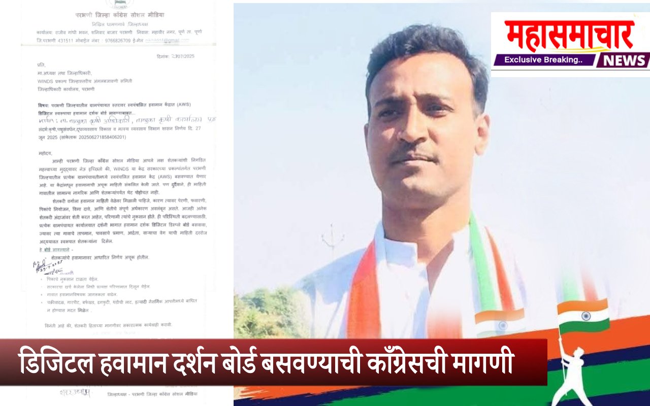 केंद्र शासनाच्या ‘WINDS’ या प्रकल्पांतर्गत परभणी जिल्ह्यात अनेक ग्रामपंचायतींमध्ये स्वयंचलित हवामान केंद्रे बसवण्यात येत आहेत. या केंद्रांमधून पर्जन्यमान, तापमान, आर्द्रता, वाऱ्याचा वेग अशा हवामानाशी संबंधित महत्वाची माहिती नोंदवली जाते. मात्र, सध्या ही माहिती फक्त ऑनलाईन स्वरूपात उपलब्ध असून गावातील सर्वसामान्य शेतकरी वर्गाला थेट व वेळेवर मिळत नाही.शेतकऱ्यांना हवामानाची अचूक माहिती वेळेवर मिळाल्यास पेरणी, पाऊस, तापमान, आर्द्रता, वाऱ्याचा वेग याबाबतची माहिती थेट पाहता येईल, फवारणी, पिकांचे नियोजन, विमा दावे, तसेच कृषी उत्पन्नाशी संबंधित इतर महत्वाचे निर्णय योग्य पद्धतीने घेणे शक्य होईल. तसेच चक्रिवादळ, गारपीट, बर्फवृष्टी, दुष्काळ, थंडीची लाट यांसारख्या नैसर्गिक आपत्तीमधून होणारे नुकसान टाळण्यासाठी देखील ही माहिती उपयुक्त ठरेल, असे जिल्हा काँग्रेस सोशल मीडियाचे जिल्हाध्यक्ष निखिल धामणगावे यांनी दिलेल्या निवेदनात नमूद करण्यात आले आहे.निवेदनावर काँग्रेसचे शहर उपाध्यक्ष पांडुरंग कदम आदींसह अनेक पदाधिकाऱ्यांच्या स्वाक्षऱ्या आहेत.