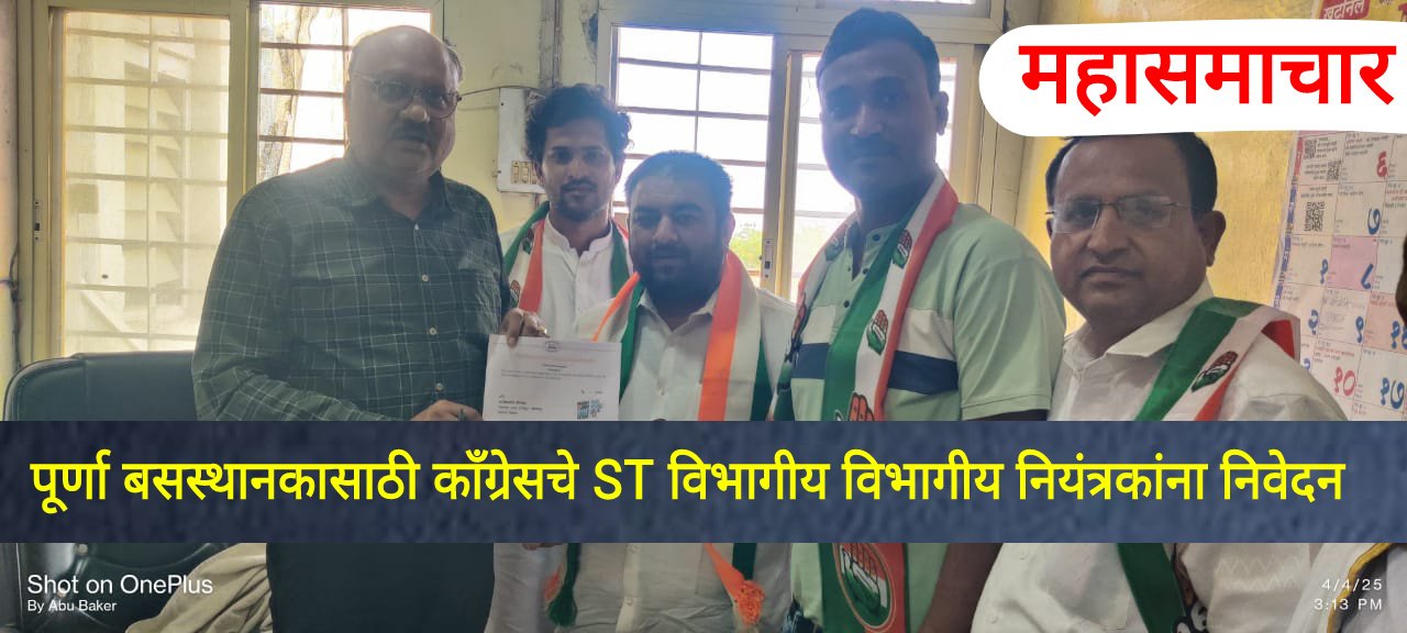 परभणी जिल्हा काँग्रेस सोशल मीडियाचे जिल्हाध्यक्ष निखिल धामणगावे यांच्या नेतृत्वाखाली एका शिष्ट मंडळाने एसटी महामंडळाच्या परभणी विभागीय नियंत्रकांची भेट घेऊन पूर्णा येथील बसस्थानकाच्या दुरवस्थेचा गंभीर प्रश्न निदर्शनास आणून दिला आहे. प्रवाशांना बसस्थानकात बसण्यासाठी पुरेशी व्यवस्था नाही, तसेच स्वच्छता आणि पाण्याच्या सोयीचा मोठा अभाव,कंट्रोलर व अन्य कर्मचारी नियुक्त करावे, जिल्ह्यासह परजिल्ह्यात जाण्यासाठी सातत्याने बसेल चालू कराव्यात अवकळा आलेल्या पूर्णा बस स्थानकाचे तातडीने आधुनिकीकरण करावे. प्रवाशांसाठी शुद्ध पिण्याच्या पाण्याची तसेच कॅन्टीनची व्यवस्था त्वरित करावी. अशा मागण्या परभणी विभागाचे नियंत्रण यांना देण्यात आलेल्या निवेदनात करण्यात आल्या आहेत. मागण्या बाबत तातडीने कारवाई न झाल्यास १५ दिवसांनंतर काँग्रेस पदाधिकाऱ्यांच्या वतीने तीव्र आंदोलन छेडण्याचा इशाराही देण्यात आला आहे.या निवेदनावर जिल्हाध्यक्ष निखिल धामनगावे यांच्या सह या. अध्यक्ष प्रल्हाद पारवे, जिल्हा उपाध्यक्ष वहीद कुरेशी, जिल्हा सचिव सुनील ठाकूर, सदाशिव वाटळ,शहर संघटक पांडुरंग कदम,विश्वनाथ मोरे,रफिक सर, तात्याराव ढोणे,अबुबकर युवक काँग्रेस,अमोल डाकोरे आदी पदाधिकाऱ्यांच्या स्वाक्षऱ्या आहेत.