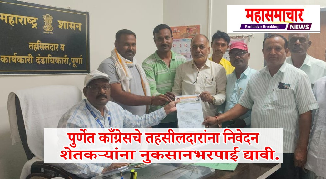 Purna Congress News अतीवृष्टीने नुकसान झालेल्या पिकांचे पंचनामे करून नुकसान भरपाई द्यावी;काँग्रेसचे निवेदन