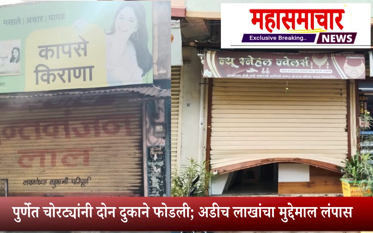 पूर्णा शहरात मुख्य बाजारपेठेतील महात्मा बसवेश्वर चौकात कैलास टाक यांचे न्यू स्नेहल ज्वेलर्स नावाचे सोन्या चांदीचे दुकान तर किंग्ज काॅर्नर परिसरात बाबु संचेती यांचे कापसे किराणा दुकान आहे.रविवारी सायं दोन्ही दुकानदारांनी दिवसभर आपला व्यवसाय करुन रात्री घरी गेले.अज्ञात चोरट्यांनी मध्यरात्री कैलास टाक यांचे दोन्ही दुकानाचे शटर वाकून आत प्रवेश करत सुमारे अडीच लाख रुपये किंमतीचे चांदीचे दागिने तसेच दुकानातील सिसीटीव्हीचे डिव्हीआर चोरून नेला.बाबु संचेती यांचे किराणा दुकानाचे ही शटर त्याच पद्धतीने वाकून आत प्रवेश करत व काजू, बदाम, साबण व इतर मौल्यवान साहित्य असा सुमारे ३० हजारांचा किराणा मालाची चोरी केली.सोमवारी पहाटे काही नागरिकांच्या हा प्रकार निदर्शनास येताच दुकान मालकांना ही बाब लक्षात आली. घटनेची माहिती पुर्णा पोलीसांना देताच पोलीस निरीक्षक विलास गोबाडे, पो.उप.नि.श्रीनिवास पडलवार, वाल्मीक भोसले व इतर पोलीस कर्मचा-यांनी भेट देऊन घटनास्थळाची पाहणी करत पंचनामा केला.पोलीसांनी घटनेचे गांभीर्य लक्षात घेऊन चोरट्यांचा भाग काढण्यासाठी ठसे तज्ञ व श्वान पथकाला पाचारण केले होते.ऐन बाजारात सदर घटना घडल्याने पूर्णा शहरातील व्यापारी वर्गामध्ये भिंतीचे वातावरण निर्माण झाले आहे.
