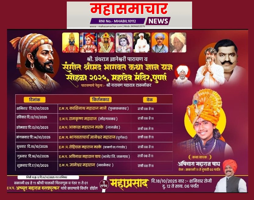 पूर्णा ता.१०(प्रतिनिधी) : शहरातील महादेव मंदिर संस्थान येथे शनिवार, (ता.११) ऑक्टोबर २०२५ पासून शुक्रवार, (ता. १७) ऑक्टोबर २०२५ या कालावधीत अखंड हरिनाम सप्ताह“श्री. ग्रंथराज ज्ञानेश्वरी पारायण व संगीत श्रीमद् भागवत कथा ज्ञान यज्ञ सोहळा “ उत्साहात पार पडणार आहे. या सोहळ्याचे पारायणाचे नेत्तुत्व ह.भ.प. श्री.नारायण महाराज टाकळीकर यांच्या मार्गदर्शनाखाली होणार आहे.दररोज सकाळी व संध्याकाळी भक्तीमय कार्यक्रमांचे आयोजन करण्यात आले असून, रात्री ८ ते ११ या वेळेत प्रसिद्ध किर्तनकार संतप्रवचन करतील.या सात दिवसांच्या पारायणात पुढील मान्यवर किर्तनकार आपले अमृतमय विचार मांडणार आहेत :