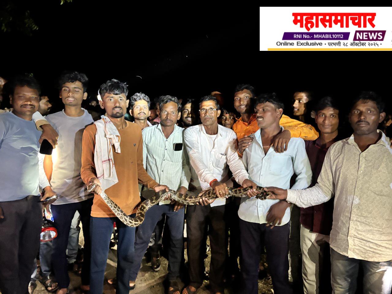 पूर्णा ता. २७ (प्रतिनिधी);तालुक्यातील मौजे मरसुळ शिवारात सोमवारी (ता. २७) सायं सात वाजण्याच्या सुमारास तब्बल दहा फूट लांबीचा महाकाय अजगर आढळल्याने गावात प्रचंड खळबळ उडाली. शेतकऱ्याच्या आखाड्याजवळ वळवळणारा हा अजगर पाहताच ग्रामस्थांची अक्षरशः धांदल उडाली.