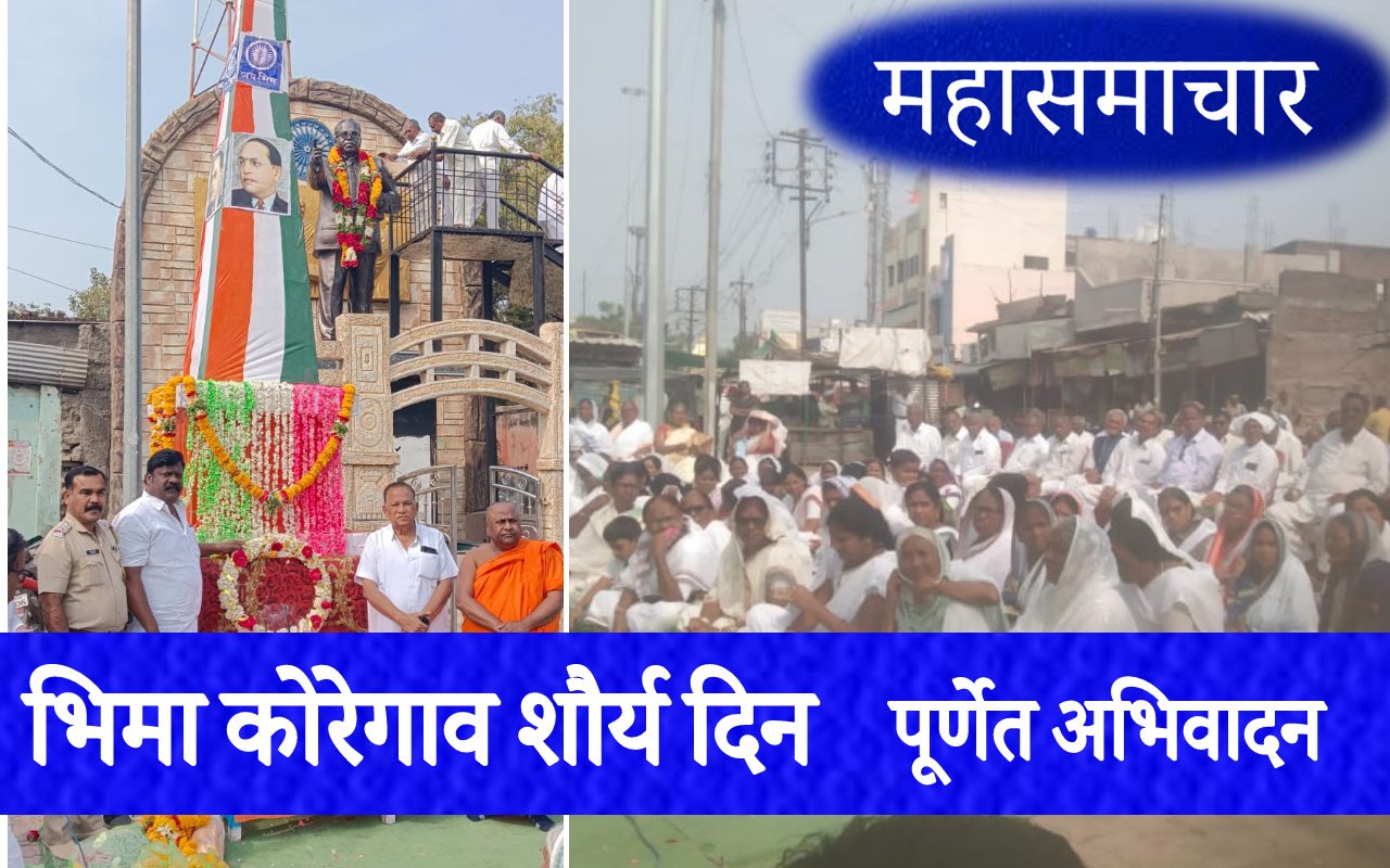 पूर्णा येथे सर्व आंबेडकर वादी कार्यकर्ते पक्ष संघटनेच्या वतीने डॉ आंबेडकर चौक येथे भिमाकोरेगाव शौर्य दिनाच्या निमिताने विजय स्तंभास अभिवादन कार्यक्रम संपन्न झाला यावेळी कार्यक्रमास प्रमुख मार्गदर्शक म्हणून पूभदंत उपगुप्त महाथेरो पोलीस निरिक्षक विलास गोबाडे रिपाइ नेते प्रकाश कांबळे माजी उपनगराध्यक्ष उत्तम खंदारे नगरसेवक ॲड हर्षवर्धन गायकवाड तुषार गायकवाड सुनिल मगरे शामराव जोगदंड दिलीप गायकवाड यांच्या पदाधिकारी उपस्थित होते यावेळी डॉ बाबासाहेब आंबेडकरांच्या पुतळ्यास पुष्पहार अर्पण करण्यात आले त्या नंतर भिमा कोरेगाव विजय स्तंभास पुष्पचक्र अर्पण करून अभिवादन करण्यात आले उपगुप्त महाथेरो यांनी त्रिशरण पंचशिल बुद्धवंदना घेण्यात आली यावेळी अभिवादन गीते व भिमा कोरेगाव इतिहासावर मान्यवरांनी मनोगत व्यक्त केली कार्यक्रमास मोठ्या संख्येने पुरुष महिला उपस्थित होते कार्यक्रमाचे सुत्र संचलन बौद्धाचार्य त्र्यंबक कांबळे यांनी केले कार्यक्रम यशस्वीतेसाठी गौतम एंगडे श्रीकांत हिवाळे अमृत कऱ्हाळे अतूल गवळी मिलिंद कांबळे उमेश बाऱ्हाटे साहेबराव सोनकांबळे यांच्या सह कार्यकर्त्यांनी प्रयत्न केले
