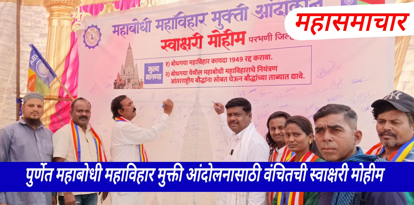 यावेळी वंचितचे युवक जिल्हाध्यक्ष तुषार गायकवाड, संदीप सावळे,सुनील मगरे,राजू नारायणकर, सिताराम रेणगडे, सुनील गवळी,अजय काळे,राधिका गोधणे, मिलिंद सोनकांबळे, शाहीर प्रकाश जोंधळे, नितीन बोधक,शबीर पठाण,शेख तौफिक यासह सर्व आंबेडकरवादी, संविधानवादी, समतावादी सह आम जनतेने सहभाग नोंदवून असंख्य स्वाक्षऱ्या केल्या. दरम्यान, बिहार राज्यातील बुध्दगया येथील महाबोधी महाविहार हे तेथील शासनाच्या ताब्यात असून त्या ठिकाणी भिख्खू संघास व भगवान गौतम बुध्दांचे आनुयायांना हिन वागणूक दिली जाते.अनेक दिवसांपासून सदर महाबोधी महाविहार आखील भारतीय भिक्खू संघाच्या ताब्यात देण्याच्या मागणीसाठी मोठे आंदोलन चालू असूनही ते मुक्त केले जात नाही.सन १९४९ च्या जाचक कायदा रद्द करुन महाविहार बौद्धांच्या ताब्यात द्यावे, बौद्ध गया येथील महाबोधी महाविहाराचे नियंत्रण आंतरराष्ट्रीय बौध्दांना सोबत घेऊन बौद्धांच्या ताब्यात द्यावे,या मागणीसाठी ठिकठिकाणी मोठे आंदोलन चालू आहे.तरीही बिहार राज्य व केंद्र सरकारला जाग येत नाही.त्यामुळे सरकार विरूद्ध भगवान गौतम बुद्ध यांच्या आनूयायातून असंतोष खदखदत आहे.