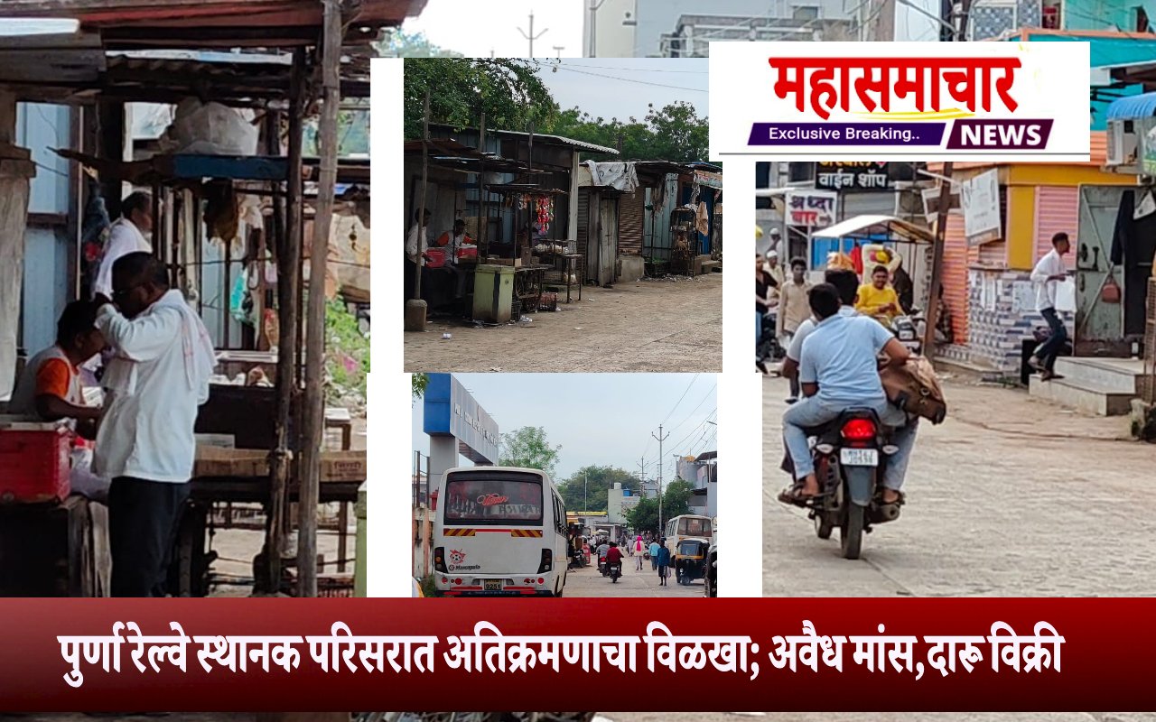 पूर्णा ता.१० (प्रतिनिधी) : पूर्णा रेल्वे स्थानक परिसर नागरिकांसाठी अक्षरशः त्रासदायक ठरत असून, अतिक्रमण, अनधिकृत व्यवसाय, दारू व मांस विक्री यामुळे या परिसरातील परिस्थिती गंभीर बनली आहे. स्टेशनच्या कंपाउंड लगत मुख्य गेटपासून अष्टभुजा देवीकडे जाणारा रस्ता अतिक्रमणामुळे जवळजवळ बंदच झाला असून दोन पदरी रस्ता आता फक्त पायी चालण्या इतकाच उरला आहे.रस्त्यावर उघडपणे मांस विक्री होत असून, दिवस-रात्र मद्यपींचा मुक्त संचार चालू आहे. या भागातून जाणाऱ्या महिला व विद्यार्थिनींना दिवसा देखील असुरक्षिततेची जाणीव होत असल्याने अनेकजण लांबचा पर्यायी मार्ग वापरण्यास बाध्य आहेत. कुटुंबासह जाणे धोकादायक बनले असून महिलांवरील छेडछाडीच्या घटना घडल्याने नागरिकांत भितीचे वातावरण आहे.