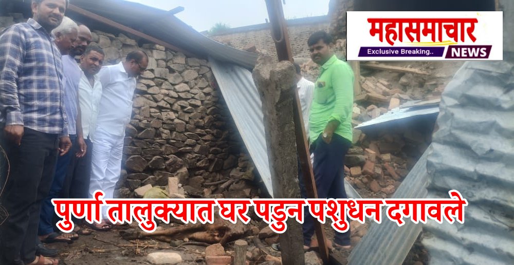 शनिवारी १३ रोजी सायं तालुक्यातील मुरलीधर किशनराव मोरे यांच्या घराचा भाग कोसळुन घरांपाठीमागे संभाजी नारायण मोरे यांची बांधलेली तीन गोवंशाची जणांवरांपैकी एक गाय मृत्युमुखी पडली तर दोन गायी जखमी झाले आहेत. घटना समजताच छगणराव मोरे (पं.स. सदस्य, पूर्णा गंगाधर मोरे (ग्राम पंचायत सदस्य), सुभाष मोरे (ग्राम पंचायत सदस्य), सदाशिव मोरे, जगन्नाथ मोरे, संभाजी मोरे तसेच मुरलीधर मोरे हे तातडीने घटनास्थळी दाखल झाले. ग्रामस्थांनी मिळून जखमी जनावरांना उपचारासाठी मदत सुरू केली आहे. दरम्यान, तलाठी प्रतिनिधी यांनीही सदर ठिकाणी भेट देऊन पंचनामा केला असून घटनास्थळीचे फोटो काढून संबंधित विभागाला सादर केले आहेत. त्यामुळे शासनाकडून पीडित कुटुंबास तातडीने मदत मिळावी, अशी मागणी ग्रामस्थांकडून होत आहे. सततच्या पावसामुळे परिसरातील अनेक घरांना भगदाडे पडले असून अशा दुर्घटनांची शक्यता वाढली आहे. प्रशासनाने याकडे गंभीरतेने लक्ष देऊन बाधित कुटुंबांना त्वरित मदत द्यावी, अशी मागणी सर्व स्तरातून होत आहे.
