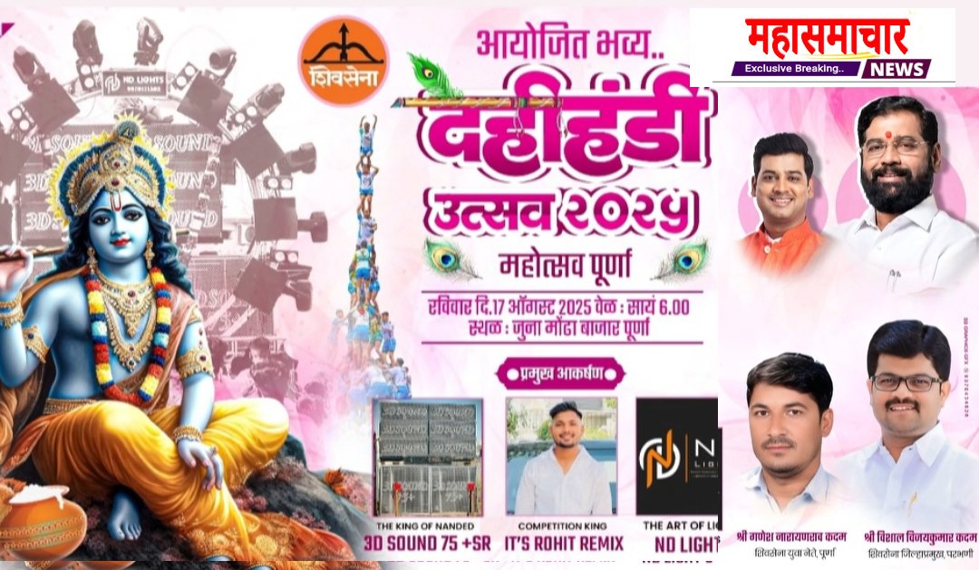 भव्य  स्वरुपात आयोजन करण्यात आलेल्या दहीहंडी महोत्सवात जास्तीत जास्त संघांनी सहभाग घ्यावा. शहरात प्रथमच होत असलेल्या भव्य दहीहंडी सोहळ्यास पुर्णा शहर व तालुक्यातील भाविकांनी मोठ्या संख्येने उपस्थित राहावे असे आवाहन शिवसेना जिल्हा प्रमुख विशाल कदम यांनी केले आहे.