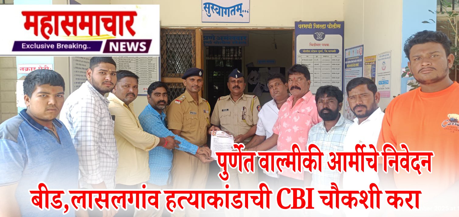 बिड-लासलगांव हत्याकांडाची CBI चौकशी करा-पुर्णेत वाल्मीकी आर्मीचे मुख्यमंत्री व गृहमंत्र्यांना निवेदन