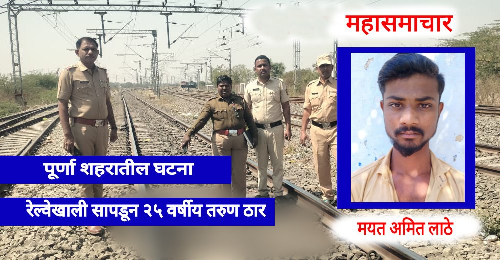अमित दिनेश लाठे रा.भिमनगर पुर्णा (वय २५) वर्ष असं त्या मयत तरुणाचे नाव आहे.रविवारी पहाटेच्या सुमारास विजयनगर भागातील नागरिकांना परभणीकडे जाणा-या रेल्वे रुळावरील हाय व्होल्टेज इलेक्ट्रीकल पोल क्र. ३१८/१६ जवळ कोणीतरी एक तरुण दोन तुकडे झालेल्या रक्तबंबाळ मयत अवस्थेत पडलेला असल्याचे निदर्शनास येताच.घटनास्थळी बघ्यांची एकच गर्दी जमली.यातील काही जागरुक नागरिकांनी स्थानिक रेल्वे लोहमार्ग पोलीसांना घटनेची माहिती कळवली. माहिती मिळताच सपोनि.हनुमंत पांचाळ, पोहेकाॅ.सचिन निकाळजे,पोकाॅ.अविनाश डावरे, होमगार्ड प्रकाश वाघमारे यांनी घटनास्थळी धाव घेऊन मृतदेह ताब्यात घेतला.पोलीसांनी सदर तरुणाची ओळख पटवत तो शहरातील भिमनगर भागातील अमित दिनेश लाठे असल्याचे निष्पन्न केले.पोलीसांनी त्याच्या नातेवाईकांना घटनास्थळी बोलावून घेत त्याची पुष्टी केली.यानंतर घटनास्थळी पंचनामा करून मृतदेह येथिल ग्रामीण रुग्णालयात उत्तरीय तपासणीसाठी पाठविण्यात आला आहे.घटनेचा पुढील तपास लोहमार्ग पोलीस सपोउपनि नेगी हे करत आहेत.