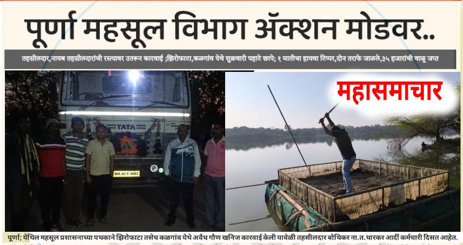 मागील दोन दिवसांपासून तालुक्यात अवैधरीत्या गौण खनिजाचे उत्करून करून त्याची चोरटी वाहतूक करणाऱ्या विरोधात कारवाई करण्यासाठी पूर्णा महसूल प्रशासन ॲक्शन मोडवर आले असून तहसीलदार बोथीकर व नायब तहसीलदार थारकर हे आप आपल्या पथकासह शुक्रवार ता.१४ रोजी भल्या पहाटे पथकास रस्त्यावर उतरल्याचे दिसून आले. त्यांनी तालुक्यातील झिरोफाटा व कळगांव येथे थेट कारवाई करीत एक मातीने भरलेला हायवा टिप्पर जप्त करत, वाळू उपसा करणारी तर दोन तराफे ताब्यात घेऊन जाळली आहेत तसेच ३५ हजार रुपयांची वाळू जप्त केल्याची माहिती समोर आली आहे.