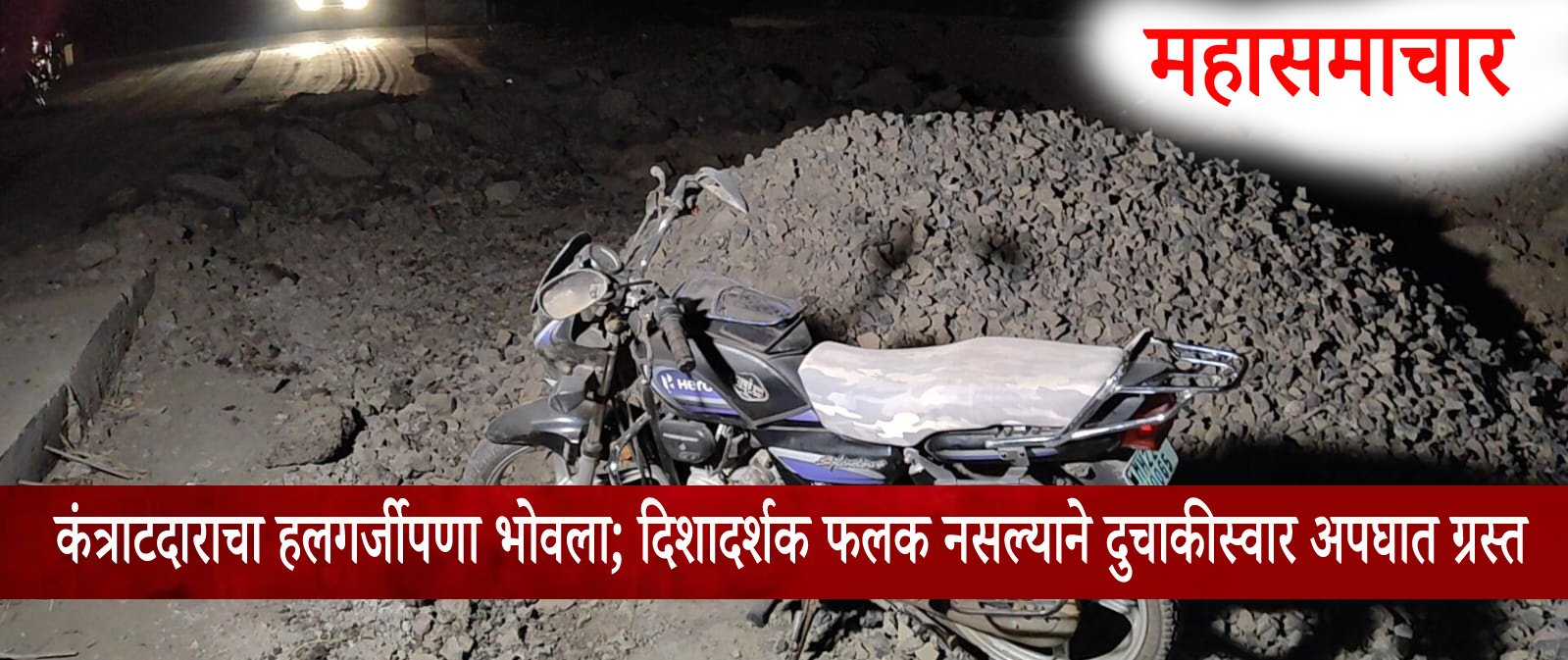 कंत्राटदाराचा हलगर्जीपणा नडला;रस्ता कामावर दिशादर्शक फलक नसल्याने दुचाकीस्वाराचा अपघात