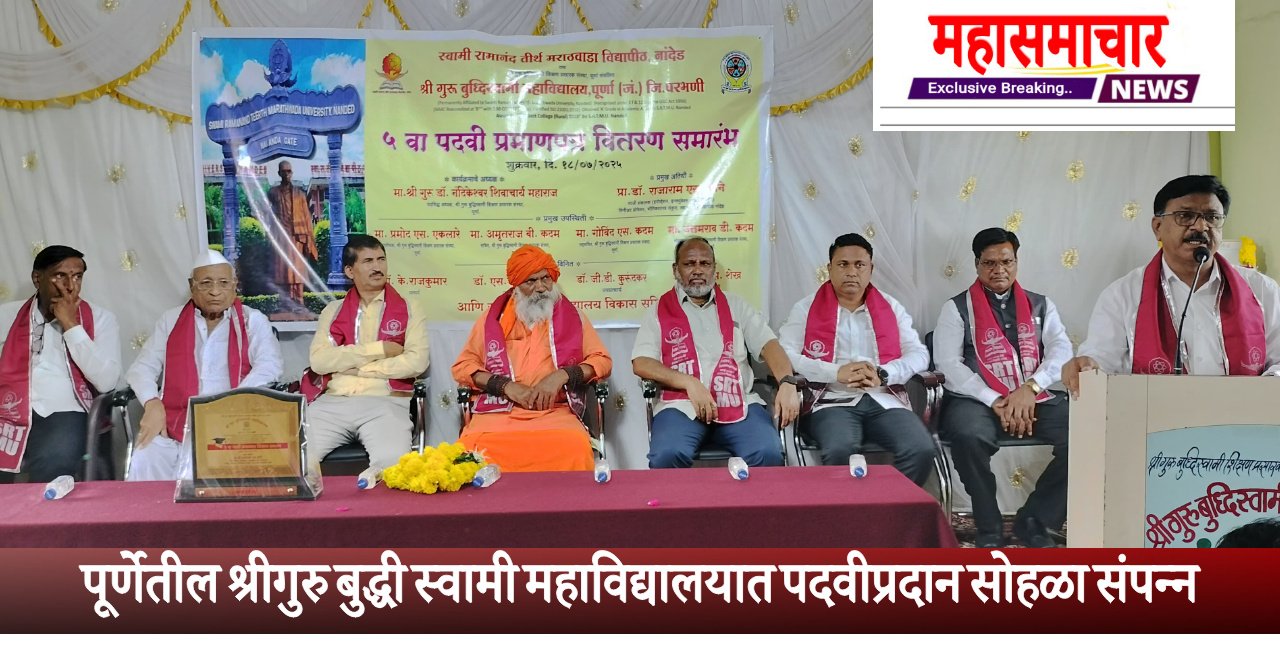 स्वा.रा.तीर्थ मराठवाडा विद्यापीठाच्या निर्देशाप्रमाणे पूर्णा येथिल श्री गुरु बुद्धिस्वामी महाविद्यालयामध्ये ता.१८ रोजी ५ व्या पदवीप्रदान सोहळ्याचे आयोजन करण्यात आले होते.प्रसंगी डॉ. माने बोलत होते.या कार्यक्रमाचे अध्यक्ष म्हणुन संस्थेचे पदसिद्ध अध्यक्ष श्री गुरु डॉ.नंदिकेश्वर शिवाचार्य स्वामीजी तर प्रमुख अतिथी कार्याध्यक्ष प्रमोदअण्णा एकलारे,सचिव अमृतराज कदम, कोषाध्यक्ष उत्तमरावजी कदम,सहसचिव प्रा.गोविंदराव कदम,प्राचार्य डॉ.के राजकुमार,यांच्या सह डॉ.गजानन कुरुंदकर, डॉ.शिवसांब कापसे, डॉ.विजय पवार,डॉ राजू शेख यांची उपस्थिती होती. यावेळी मान्यवरांच्या हस्ते २०२४-२५ मध्ये उत्तीर्ण झाले ६९ विद्यार्थ्यांना पदवी प्रमाणपत्र प्रदान करण्यात आले.