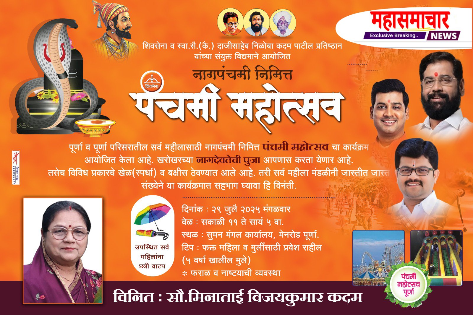 पूर्णा शहर व पूर्णा परिसरातील सर्व महीलांसाठी नागपंचमी निमित्त पंचमी महोत्सवाचा कार्यक्रम मंगळवारी (ता. २९) आयोजित करण्यात आला आहे. केवळ महिलां व मुलींसाठीच हा कार्यक्रम आहे. सुमन मंगल कार्यालयात सकाळी अकरा ते सायंकाळी पाच दरम्यान महोत्सव होणार आहे. यावेळी खरोखरच्या नामदेवतेची पुजा करण्याची संधी यावेळी महिलांना मिळणार आहे . तसेच महिलांचे विविध प्रकारचे खेळ व स्पर्धा आयोजित करण्यात आल्या आहेत. विजेत्यांना आकर्षक पारितोषिके देण्यात येणार आहेत. तसेच सहभागी सर्व महिलांना छत्री भेट देण्यात येणार आहे. अल्पोपाहाराची सोय करण्यात आली आहे. यावेळी झोके, आकाशपाळणा, चक्री, जंपींग आदींची व्यवस्था करण्यात आली आहे. तरी जास्तीत जास्त महीलांनी पंचमी महोत्सवात सहभागी व्हावे असे आवाहन आयोजक मिनाताई कदम यांनी केले आहे.